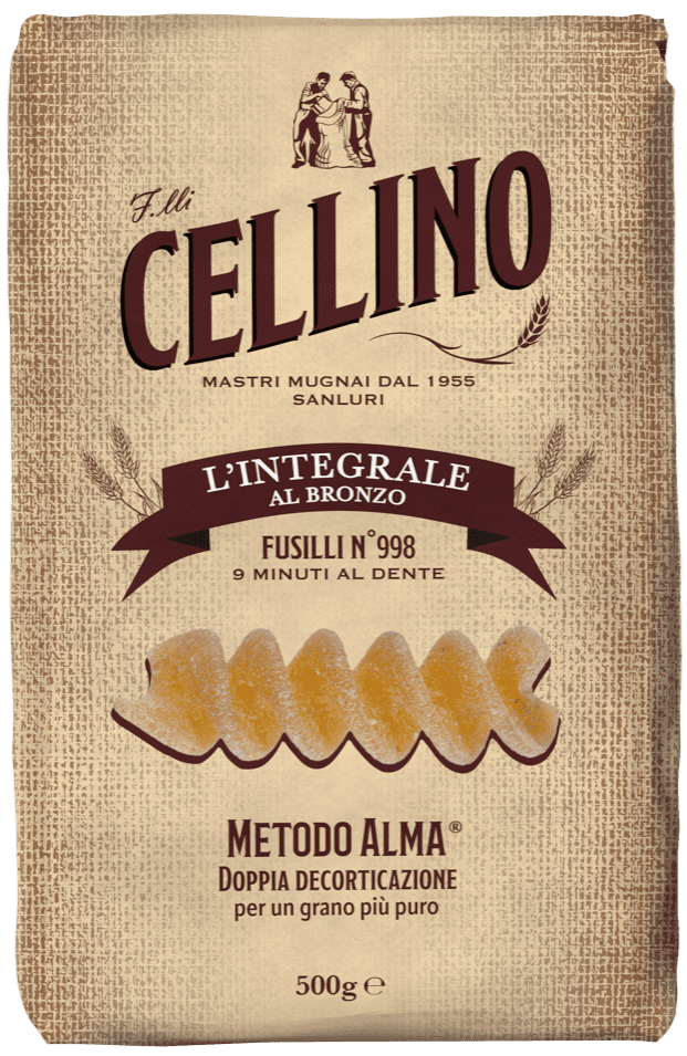 Fusilli no. 998 are a versatile format, capable of transforming under the caress of juicy tomato sauces, aromatic pestos, sautéed vegetables and cream cheese. The writing on the label “whole-wheat bronze-drawn”, indicates the uniqueness of these fusilli, produced with whole-wheat semolina and bronze-drawn for a rough surface and an enveloping spiral that captures and retains the sauce.