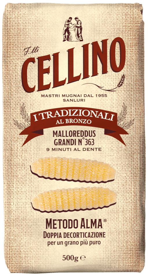 Their history is rooted in ancient times, when pasta was the beating heart of the Sardinian table. Large Malloreddus no. 363 stand out by being narrow and long and are accompanied by rich meat sauces, such as ragù of sausage or pork, or fresh tomato-based condiments, dried tomato, and grated Sardinian pecorino cheese.
